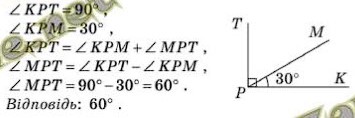 Побудуй прямий кут KPT і проведи в ньому промінь PM так, щоб ∠KPM = 30°. Знайди міру кута MPT.